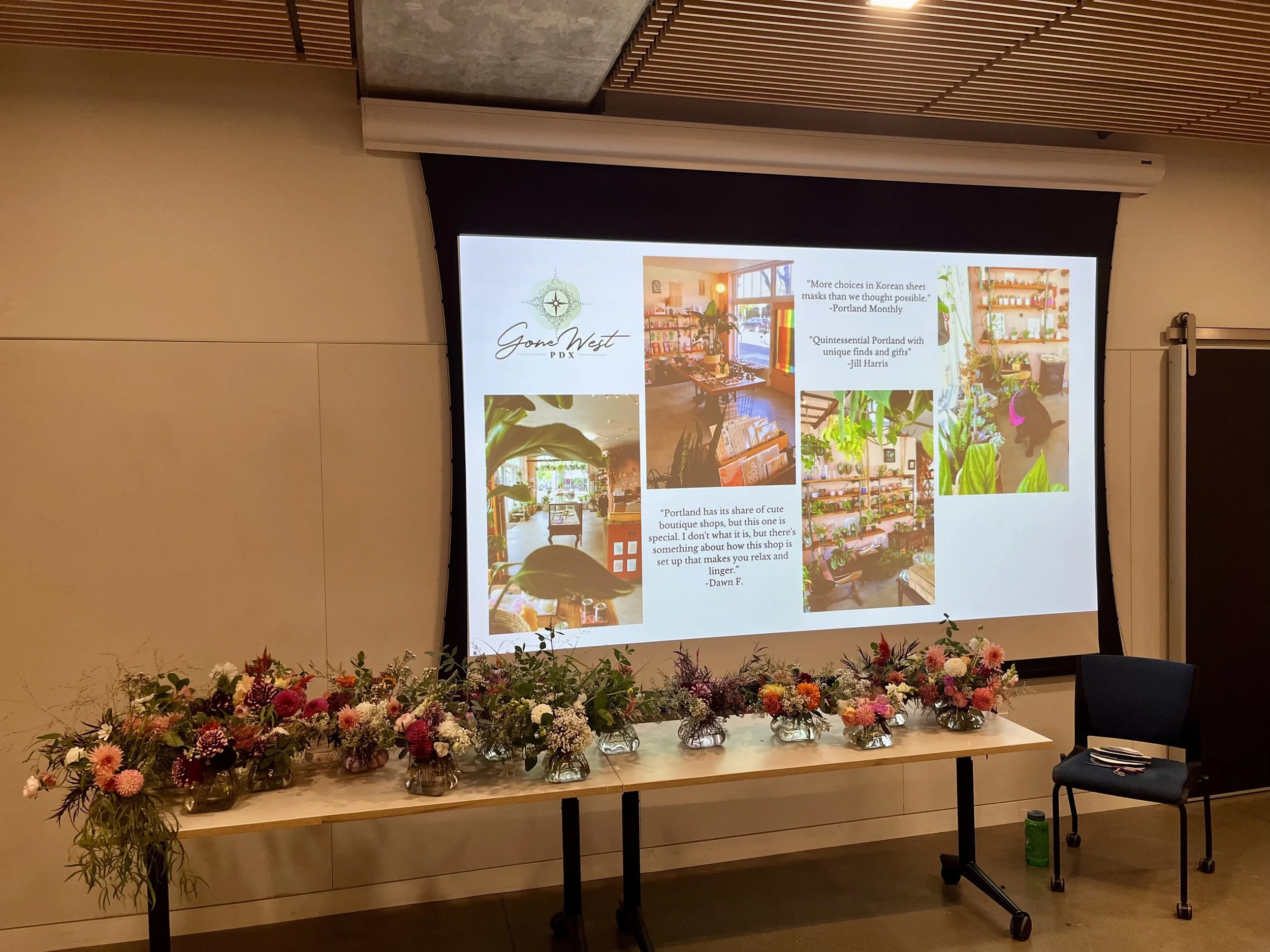 We arrived at Reed College with all of our supplies and spent the evening with students and staff talking about; the importance of native flowers, how to make a bouquet, and then let our creativity flow as each participant made a stunning floral arrangement with farm fresh flowers. All supplies were provided by us and each participant got to bring home a vase with their flowers as well as specially designed for this event coupons and gifts.